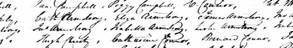 Namely, Cath[erine] Armstrong, Eliza[beth] Armstrong, James Armstrong, John Armstrong, William Armstrong; then Ja[me]s Armstrong, Isabella Armstrong, Leslie Armstrong, Isabella Armstrong, Ja[me]s Armstrong. The only name missing is Alexander Armstrong Jr., who was born in Ohio in 1810, so the fact that he is not listed here is further evidence we have the right group.